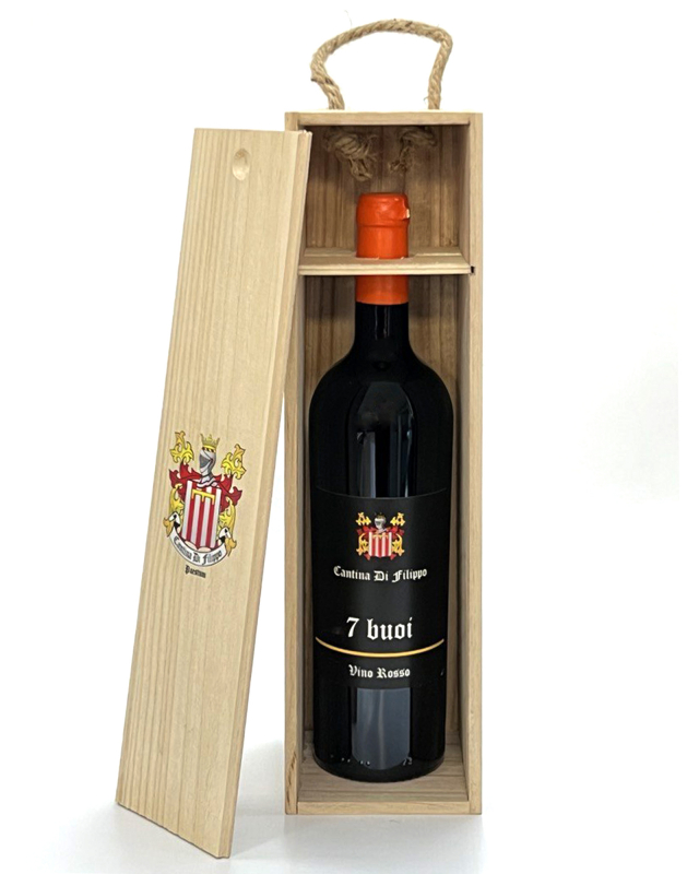 Confezione regalo ricercata, bauletto in legno completo di bottiglia di vino Merlot 7 buoi.