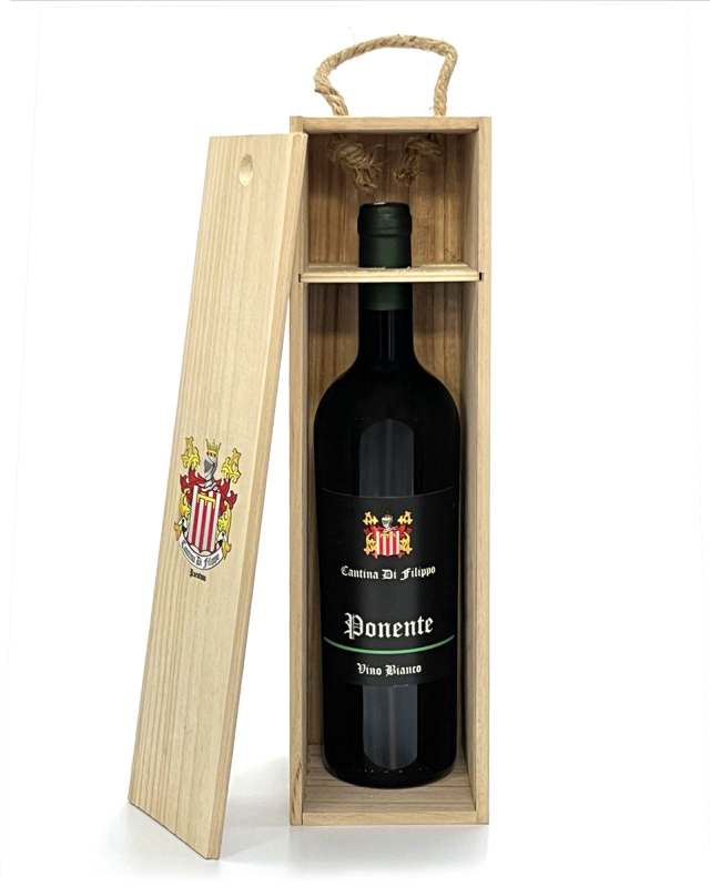 Confezione regalo ricercata, bauletto in legno completo di bottiglia di vino Greco Ponente.
