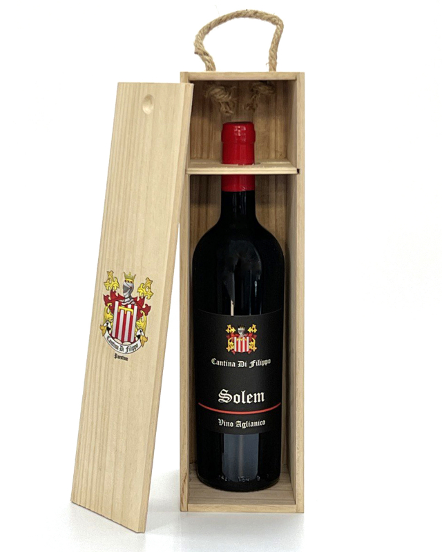 Confezione regalo ricercata, bauletto in legno completo di bottiglia di vino Aglianico Solem.